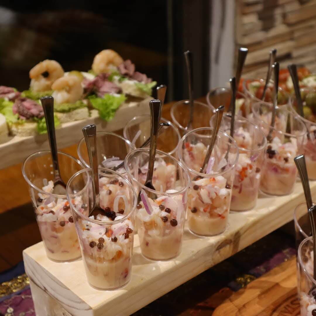 En la modalidad Coctel Tradicional el cliente puede escoger un mixto de hasta 10 categorías de productos de nuestra lista de propuestas: canapes, bruschetas, etc. Posterior a esta selección se determinan los detalles puntuales.